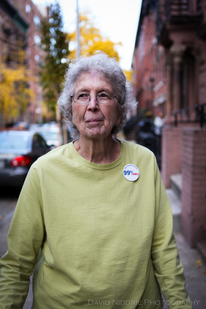 Walking through Greenwich Village I met a resident handing out ‘99%’ buttons. She is a member of the Village Independent Democrats, a club formed in 1957 to help shape a progressive agenda in city and village politics. She was out on a Sunday afternoon, chatting with neighbours and letting people know about the OWS movement. It was great speaking with a long-time resident who continues to fight for the future of her community. She was kind enough to pose for a portrait on West 12th St, near Greenwich Ave.