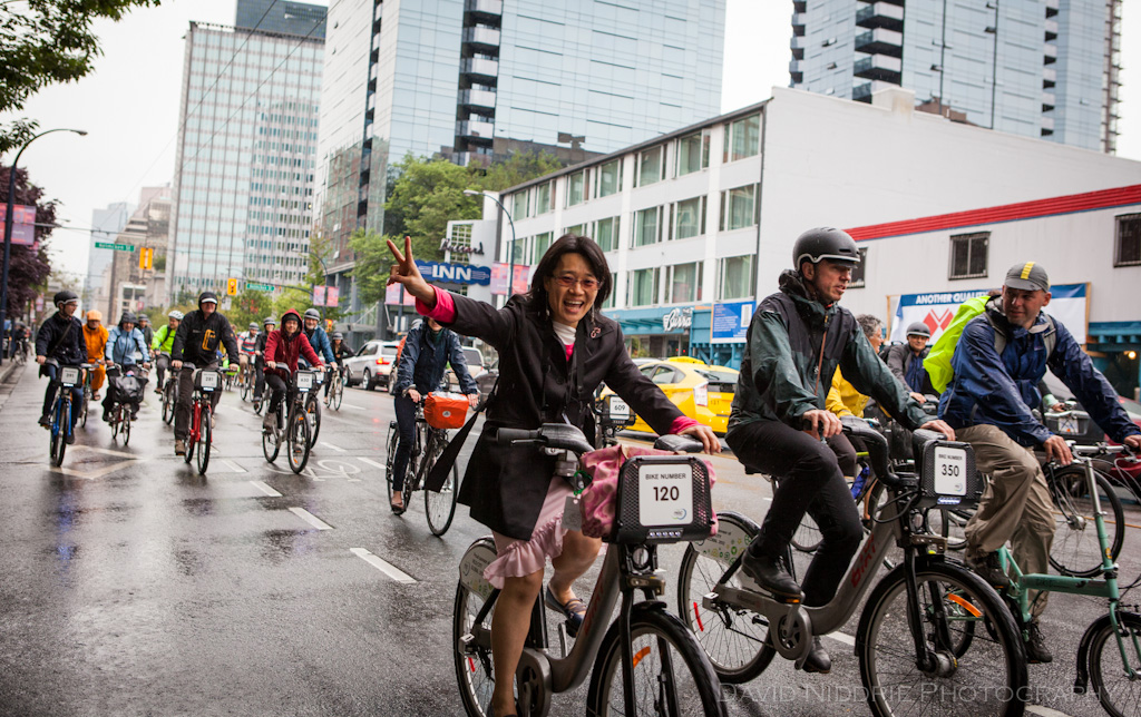 Dr. Hsin-wen Chang, Taiwan, gestures during the Bike Parade