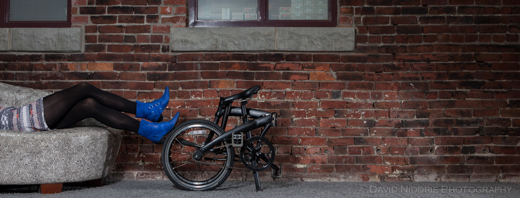 A feature lead image, shot for Momentum Mag’s recent Style piece on boots for riding. We decided to do a two-page shot, across the very top of the spread with room on the right for a headline and intro. Shot on location at John Fluevog Gastown, with Lauren modeling a pair of those sexy, blue Fluevog Truth Genevieve boots on a Dahon Mu Uno.