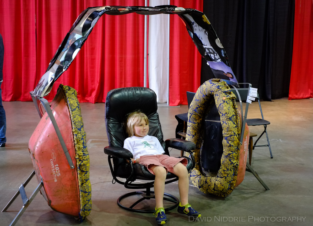 Giant headphones made of wheelbarrows, pumping Daft Punk