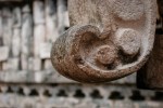 Continuing my Maya photo series, we’re in the Puuc hills at Labná, dating from between A.D. 600 and 900, and only a short way from Uxmal, the ceremonial centre of this region. You are greeting by turkeys, a caretaker’s thatched-roof house and soon, El Palacio – the ruins of a large building in the Puuc-style of architecture. Chaac masks are present, a serpent is seen with a human face emerging from the mouth (image above) and a reconstructed sacbé leads to the open middle grounds. Sacbé is the ‘white road’ the ancient Maya constructed as sacred walkways connecting their cities. This one had run 30km to Uxmal and points beyond. The stunning arch seen in the middle images has been extensively restored, giving a glimpse of what once was in these parts. Other arches have been lost to time and the jungle. Past the arch is El Castillo – the remains of a pyramid now perched atop a large pile of rubble and rock.