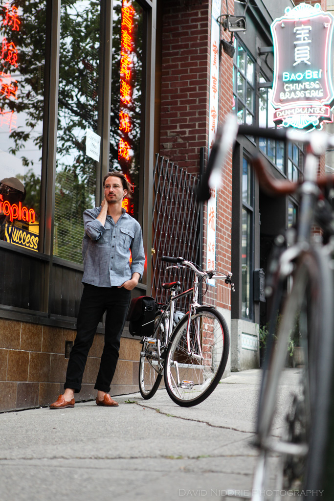 “Downtown Rider” — Photo set number three from the Momentum Mag City Bike City Life Look Book 2014. Earlier, we saw Sean and the Vanmoof, followed by Frederique & Patrice with Mozie and here we are with our friend Craig in Vancouver’s Chinatown. He rides a Biria CitiClassic Sport i3, equipped with Racktime, WALD, Light & Motion and Trelock accessories and wearing United By Blue and Bern.