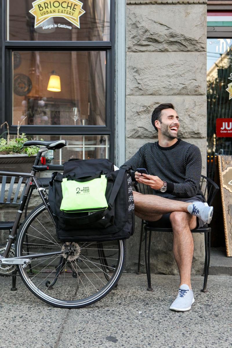 A man poses on a Vancouver street with Two Wheel Gear bicycle pannier.