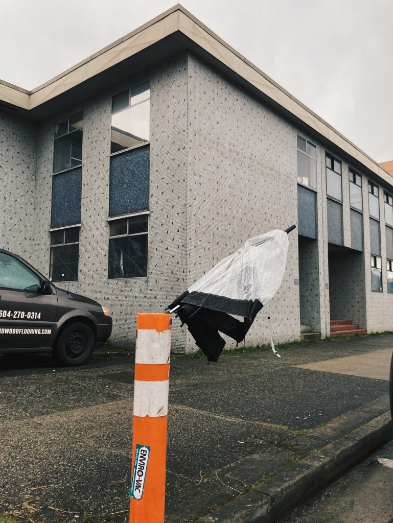 I seek out abandoned umbrellas you see. I don’t, like, base my day around it but I have been known to alter my route knowing a ‘dead brolly’ hotspot is on that street, not this one. Think transit exchanges, trash bins near bus stops, hedges close to institutions. That kind of thing. The day after monsoon rain and blustery wind shows a curious trait in people — they just toss their shelters when the weather improves.